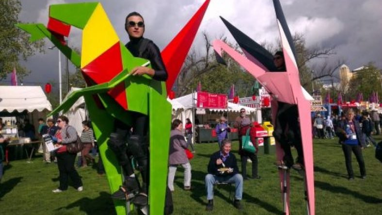 Our beautiful roving Origami Creatures on stilts had a fantastic time at Festivale 2017 in Launceston. 3 days of food, music and fun! (photo taken at a similar event)