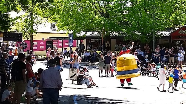 It was Bingle Bell all the way for our very popular giant Stilt Christmas Bell at a Christmas Parade in Stirling, Adelaide Hills. Great crowds and reactions with roving on the Oval afterwards also. Bingle Bell is designed for stilts or high unicycle and depending on the event, we interchange between the two.