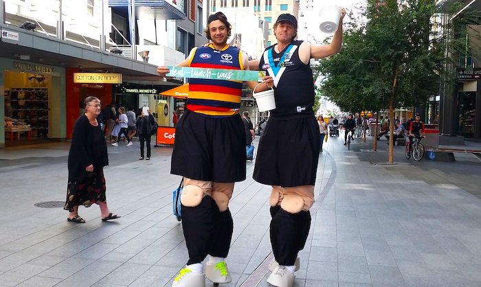 With an AFL match about to go on at Adelaide Oval, our big and interactive Aussie Rules Football Stilt Walkers were helping with a Myer Centre Adelaide corporate promotion over the weekend. Attracting customers to a place is the great skill of our stilt performers, where that extra attention to characters and costuming translates into the public engaging with a corporate drive. Lots of vouchers given out to happy football & Myer customers!