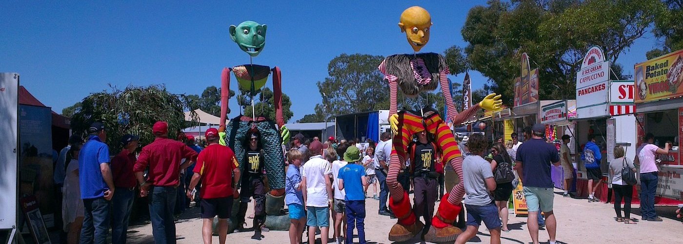 Mark Easson aka Scoot the Stunt Juggler is certainly getting around as he performers a fantastic package of entertainment for Agricultural Shows, big and small. At Loxton Show and Royal Hobart Show he performed his well honed Scoot the Stunt Juggler show to enthralled audiences; then it was off his 3 metre tall unicycle and into a 5 metre tall Giant Puppet for some spectacular roving. He even battled on with the erratic South Australian and Tasmanian weather – such a trouper!