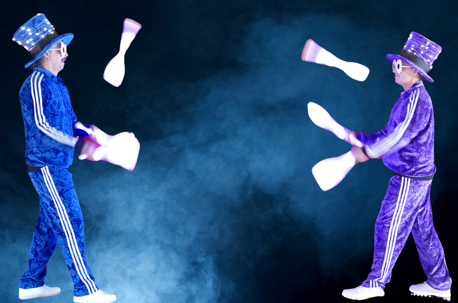 With LED lights on hats, shoes and amazing LED juggling clubs, this duo are skilled performers and are loads of fun.