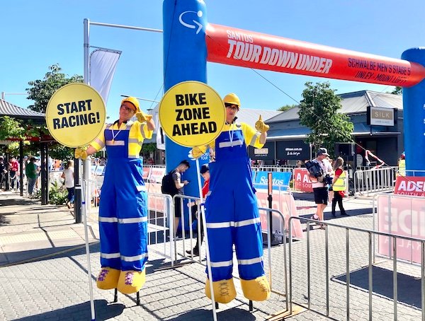 Our NEW Stilt Traffic Controllers were able to be themed for a morning at the Santos Tour Down Under in Adelaide today, with lollipop signs that said “Bike Zone Ahead” and “Start Racing”. Immediately recognisable this new stilt act is proving to be a huge hit with the crowds who are totally into going along with the comedy and fun.